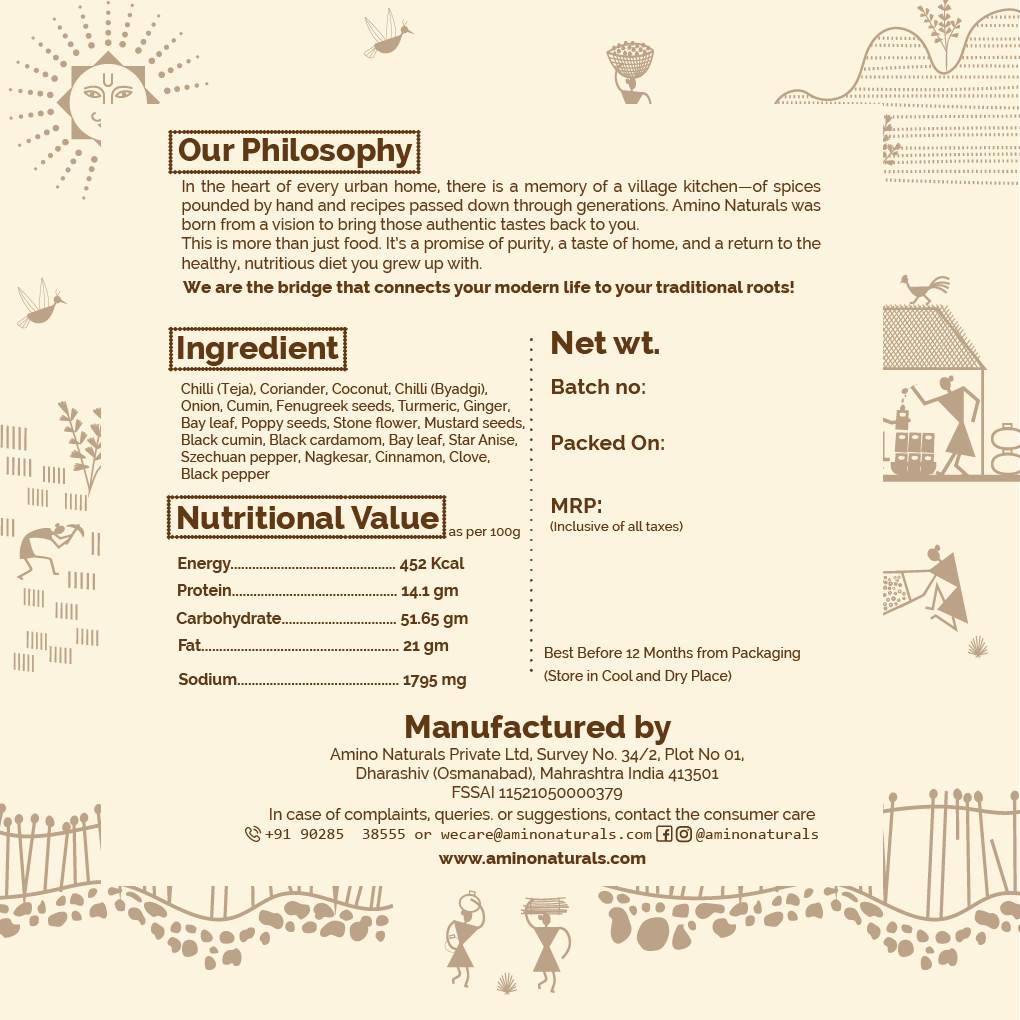 Chilli (Teja), Coriander, Coconut, Chilli (Byadgi), Onion, Cumin, Fenugreek seeds, Turmeric, Ginger, Bay leaf, Poppy seeds, Stone flower, Mustard seeds, Black cumin, Black cardamom, Bay leaf, Star Anise, Szechuan pepper, Nagkesar, Cinnamon, Clove, Black pepper