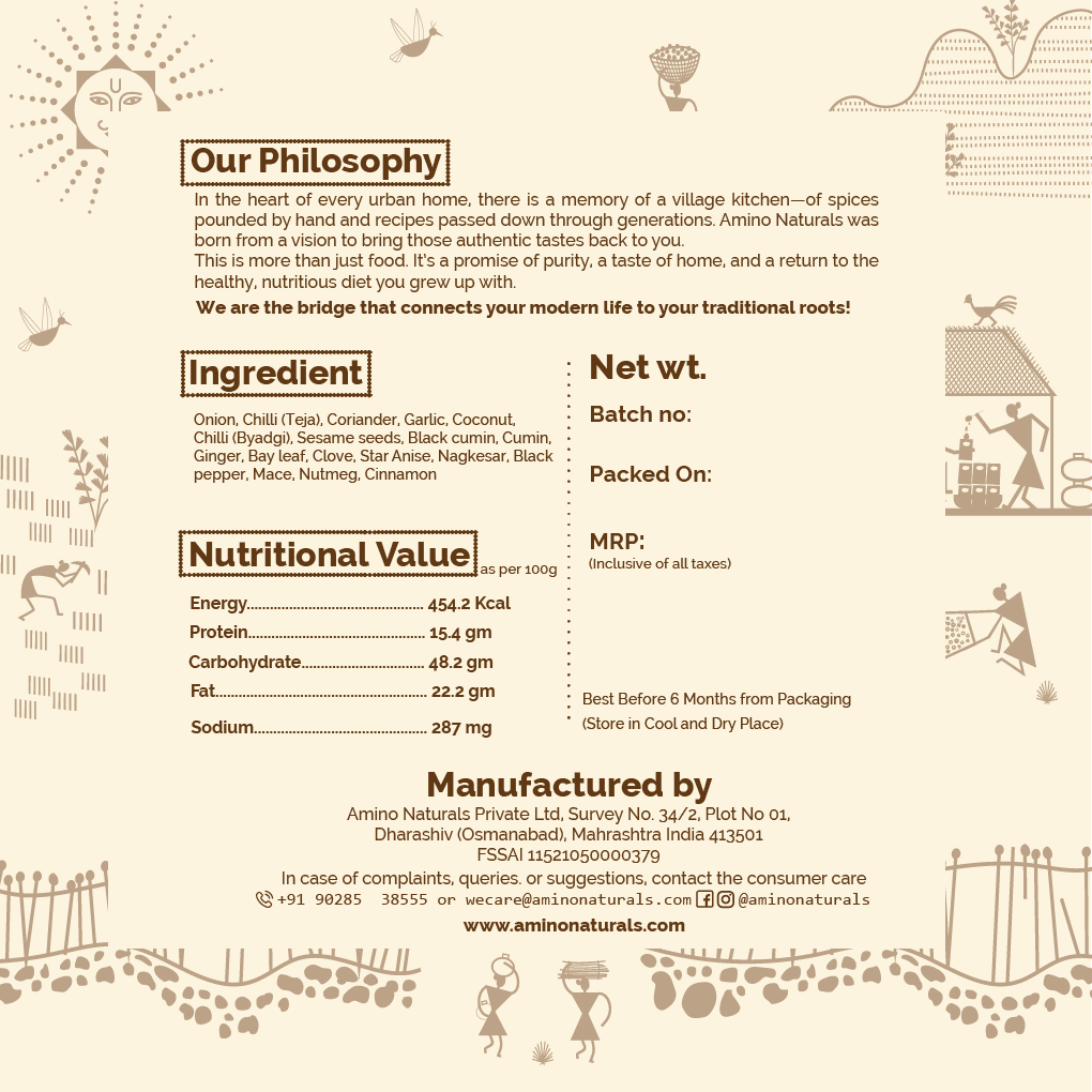 Onion, Chilli (Teja), Coriander, Garlic, Coconut, Chilli (Byadgi), Sesame seeds, Black cumin, Cumin, Ginger, Bay leaf, Clove, Star Anise, Nagkesar, Black pepper, Mace, Nutmeg, Cinnamon