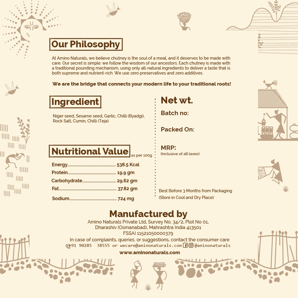 Niger seed, Sesame seed, Garlic, Chilli (Byadgi), Rock Salt, Cumin, Chilli (Teja)